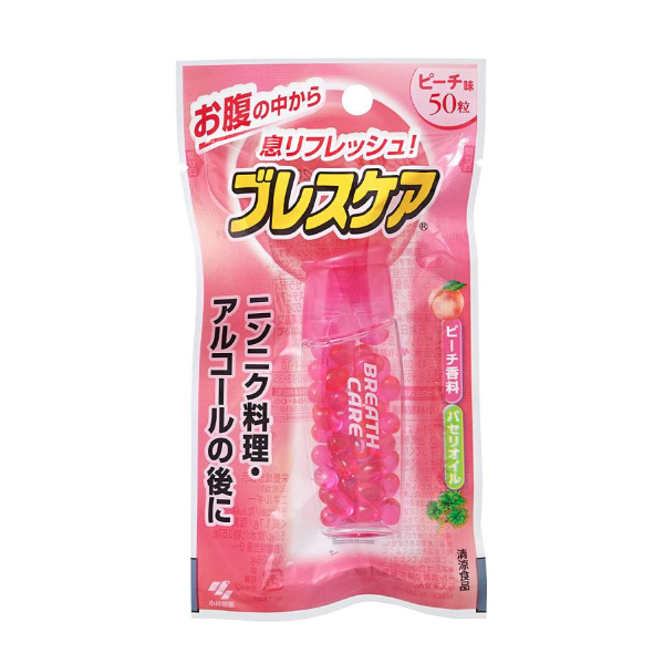 在大蒜菜餚和酒精之後清新胃部的氣息! 當您用水飲用時,含有清涼成分(薄荷醇和歐芹油)的膠囊會直接到達您的胃部,使您的口氣從胃部清新。